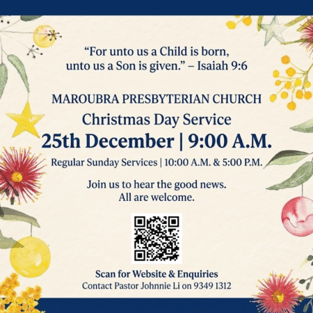 Join us at Maroubra Presbyterian Church as we celebrate the incarnation of our Lord Jesus Christ through Scripture readings and traditional carols. It is a simple, reverent service focused on the good news of the Gospel.